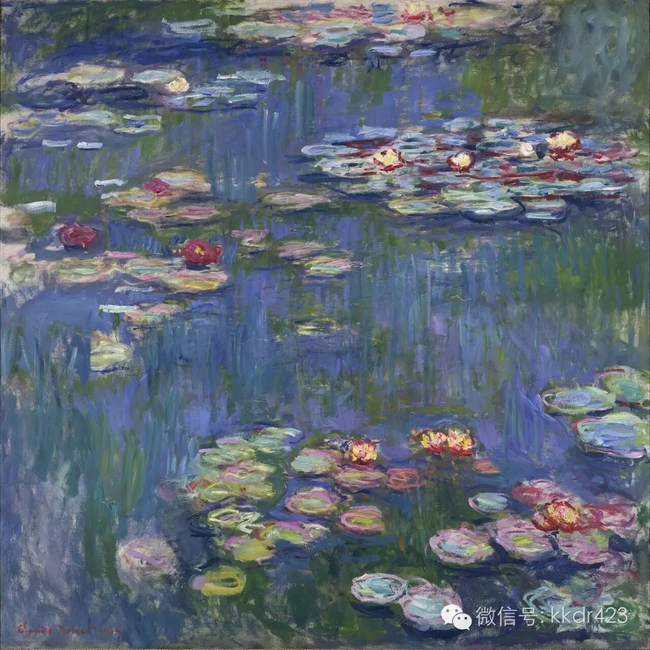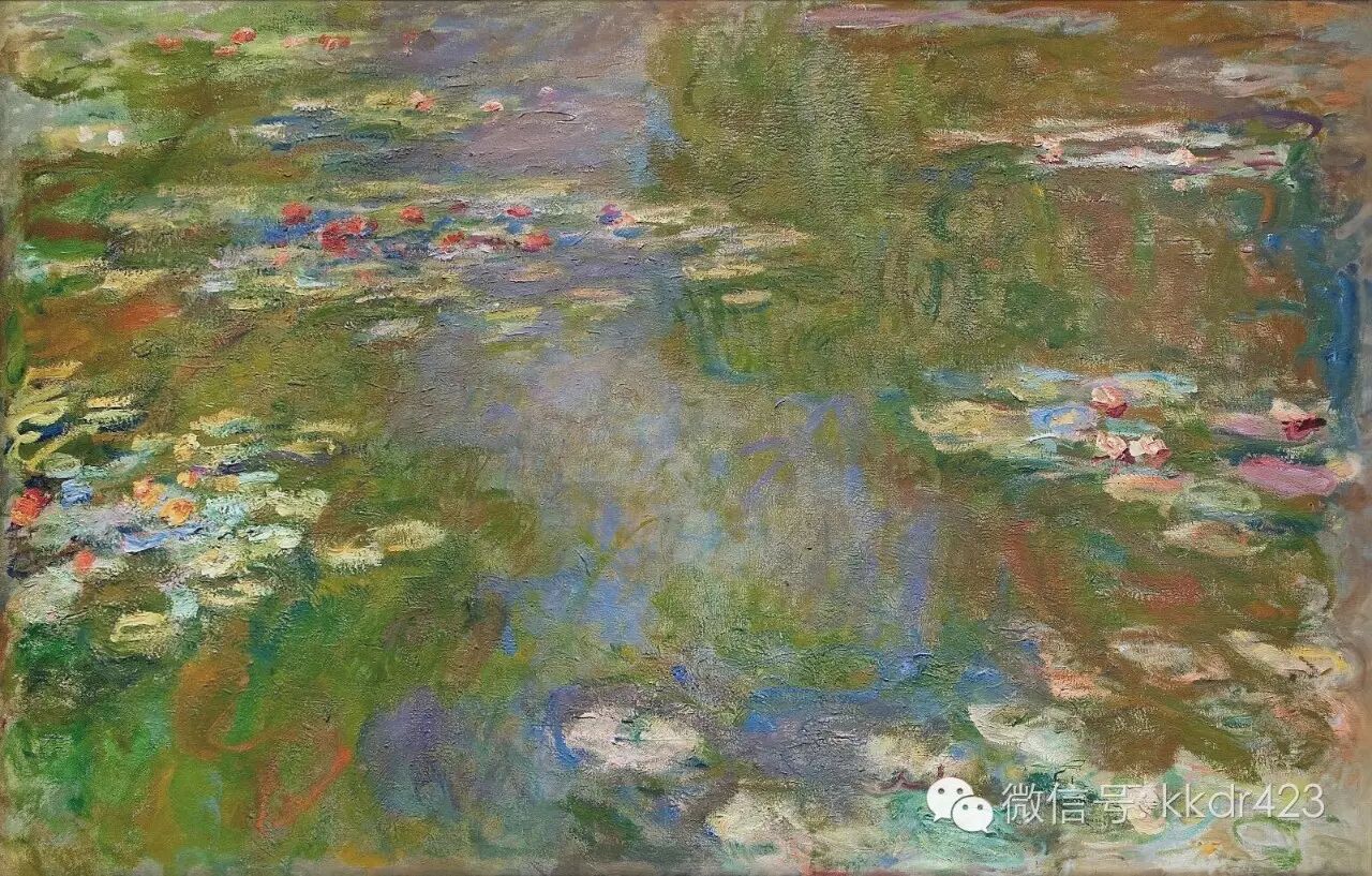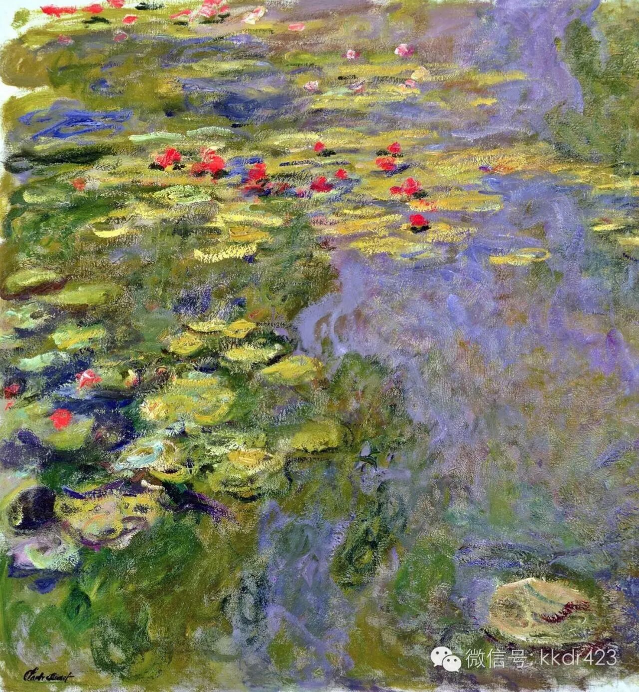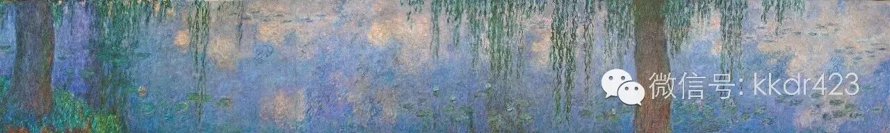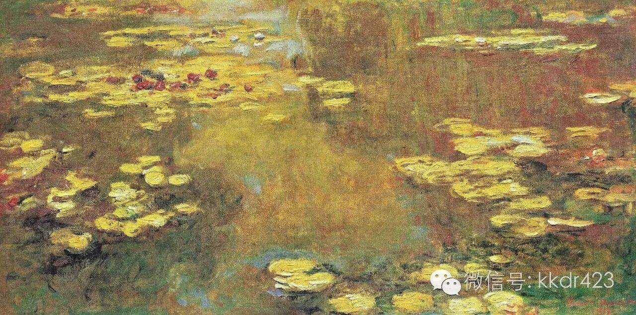 晚年的莫奈,已然成为了大师级的人物,搞了一个系列的鸿篇巨作《睡莲》,这幅作品,长12米多,也是倾注了莫奈终身的研究成果的集大成之作。在一战期间,这次他一步也没有离开自己的花园和作品,即使战火烧近家门。莫奈自己言道:“如果我注定死于战争,就让我死在我的画前,死在我的作品前。”