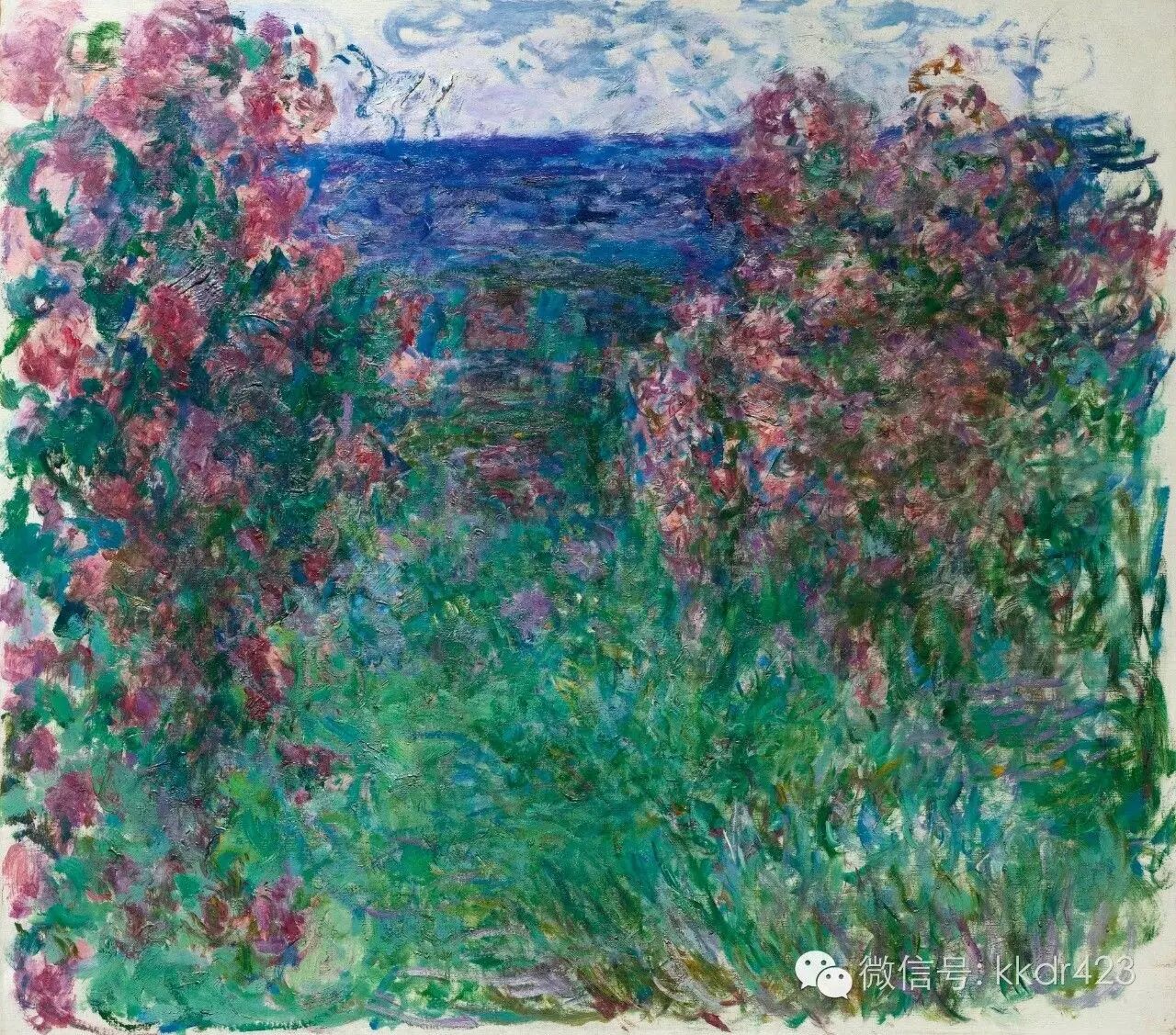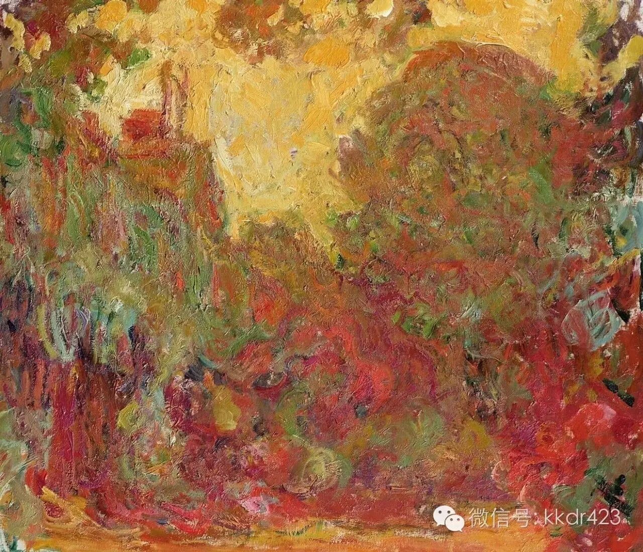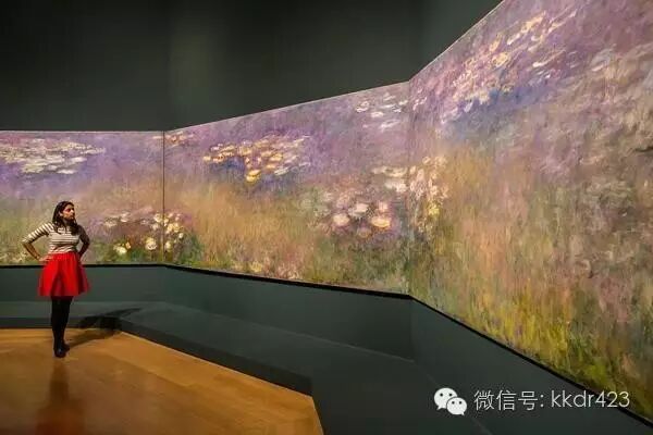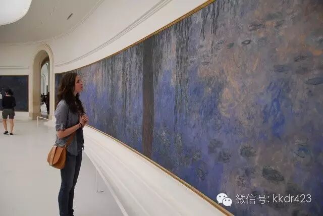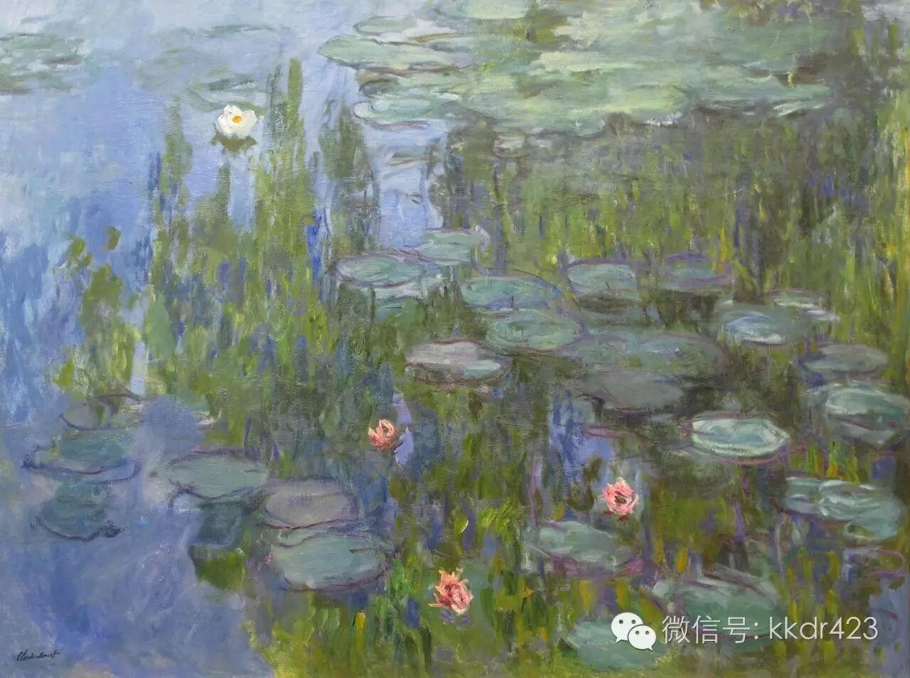 晚年的莫奈,已然成为了大师级的人物,搞了一个系列的鸿篇巨作《睡莲》,这幅作品,长12米多,也是倾注了莫奈终身的研究成果的集大成之作。在一战期间,这次他一步也没有离开自己的花园和作品,即使战火烧近家门。莫奈自己言道:“如果我注定死于战争,就让我死在我的画前,死在我的作品前。”