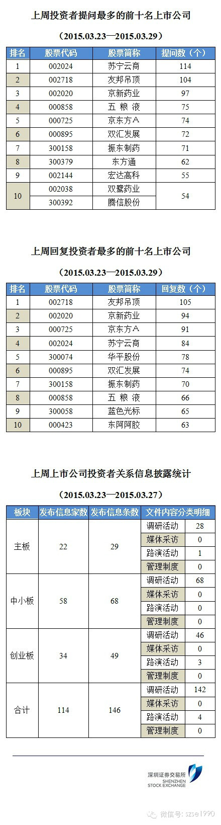 上周,我所互动易收到投资者日常问题共14171条,其中有效问题11598条,上市公司回复10269条(含本周对以往问题的回复);共有114家上市公司发布146条投资者关系活动记录文件。互动易APP目前已正式上线,进入以下网址可下载安装:苹果版http://t.cn/8sPr5SE,安卓版 http://t.cn/8sPrfIY。