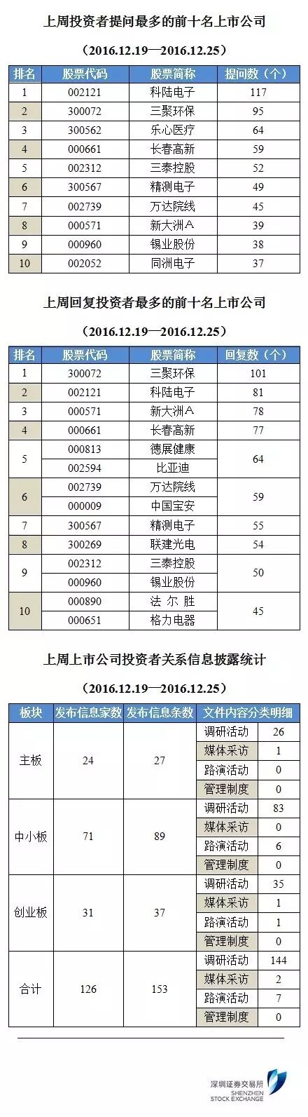 上周,我所互动易收到投资者日常问题共10660条,其中有效问题7237条,上市公司回复7787条(含本周对以往问题的回复);共有126家上市公司发布153条投资者关系活动记录文件。互动易APP目前已正式上线,进入以下网址可下载安装:苹果版http://t.cn/8sPr5SE,安卓版 http://t.cn/8sPrfIY。