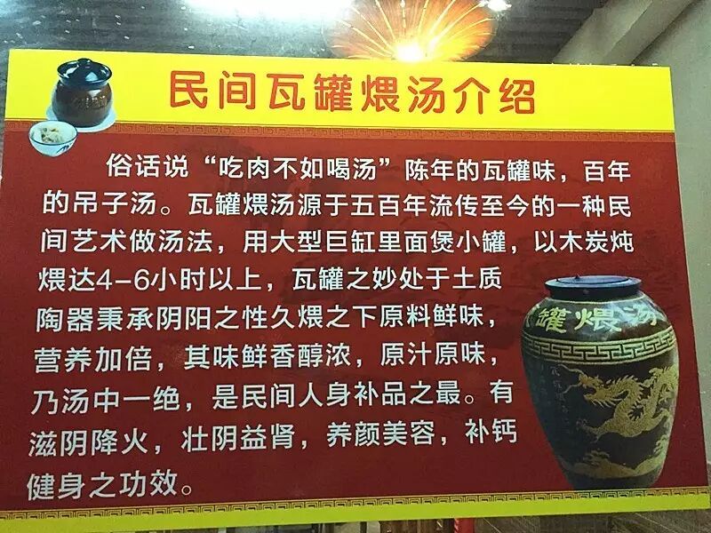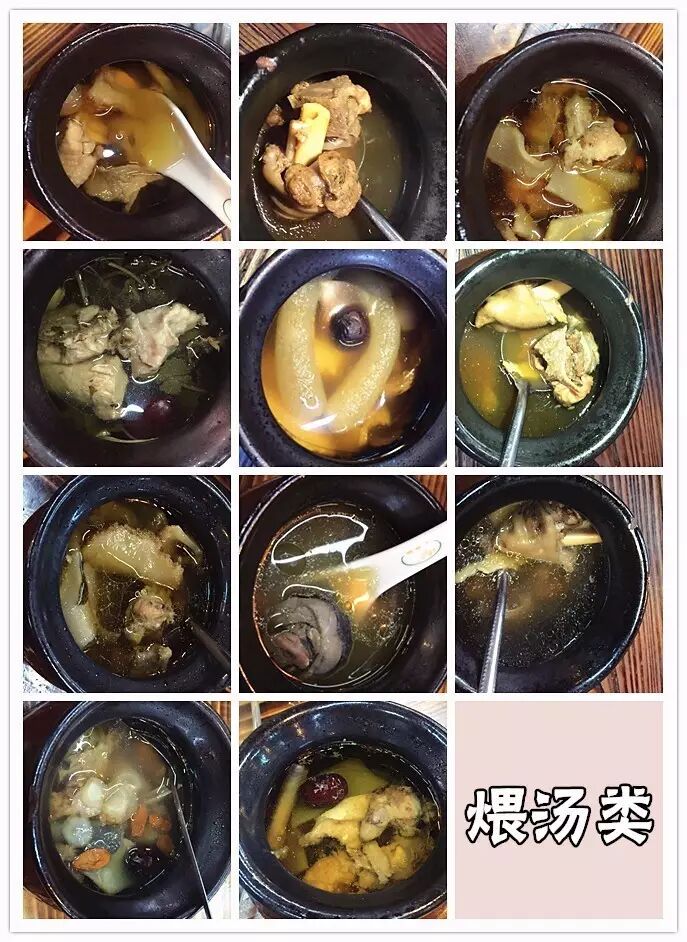 煨汤种类有:天麻雀仔汤、鳅鱼地柏汤、栗果鸡汤、羊胎素当归汤、雷公根汤、勒果南北杏汤、竹生菌猴头菇汤、甲鱼药材汤等等~