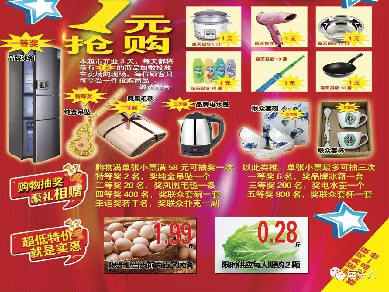 开业当天前200名顾客可购1.99元/斤鸡蛋一份;一元抢购电水壶、炒锅等,百种特价,千种新品。开业期间来就送,买再送,与厂家联系手大活动。