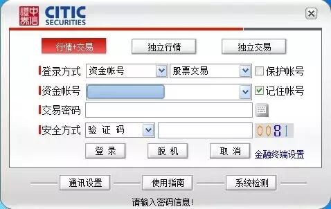 3、双击快捷方式,点击【行情+交易】登陆,输入【资金账号】和【交易密码】。