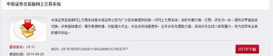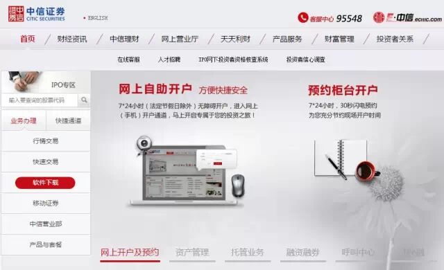 1、登陆中信证券官网(http://www.cs.ecitic.com/)首页,点击左侧【业务办理】—【软件下载】