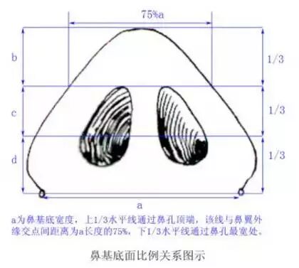 这是指从下往上看时,鼻尖、鼻翼、鼻孔的形态。鼻底也有很复杂的相互比例,鼻小柱的高度、鼻翼和鼻孔的形态等,都会影响到鼻子整体的观感。
