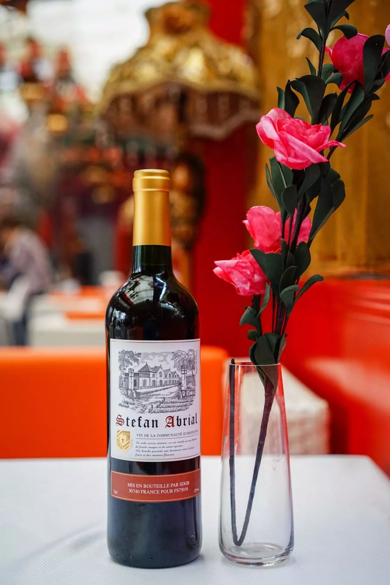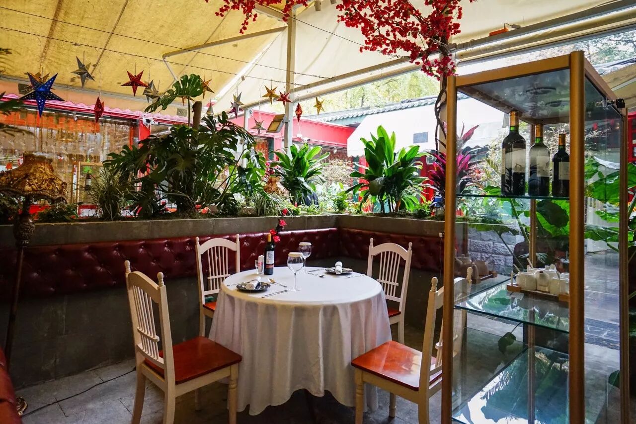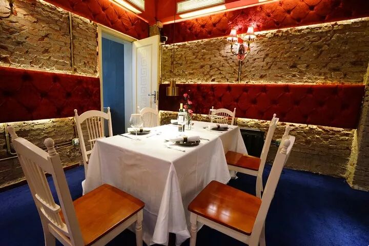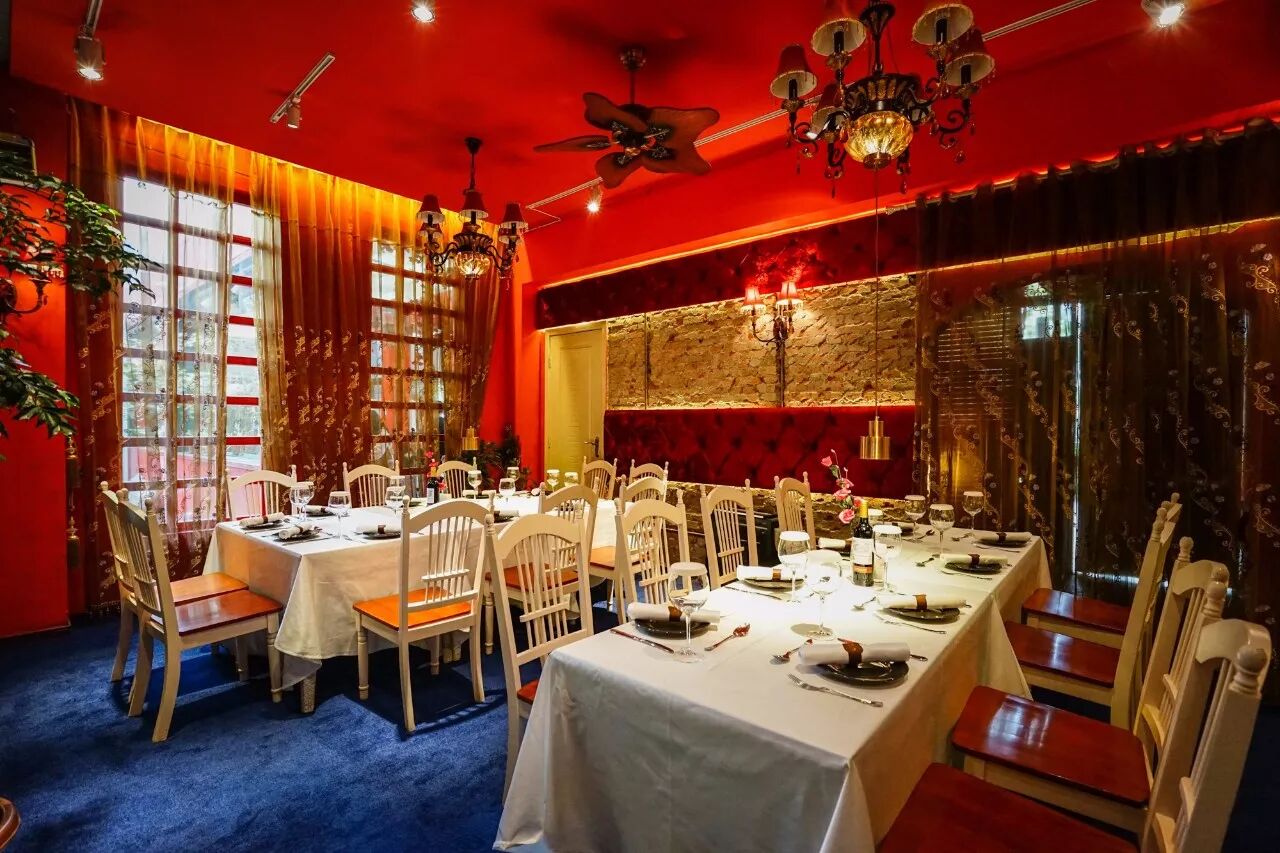四方桌铺上干净整洁的白桌布,墙上是红色丝绒的背景软包,头顶是欧式的吊灯,桌上是红酒高脚杯和玫瑰,耳边是轻柔的轻音乐,你说这种环境下能不多吃点吗?能不多拍点吗?