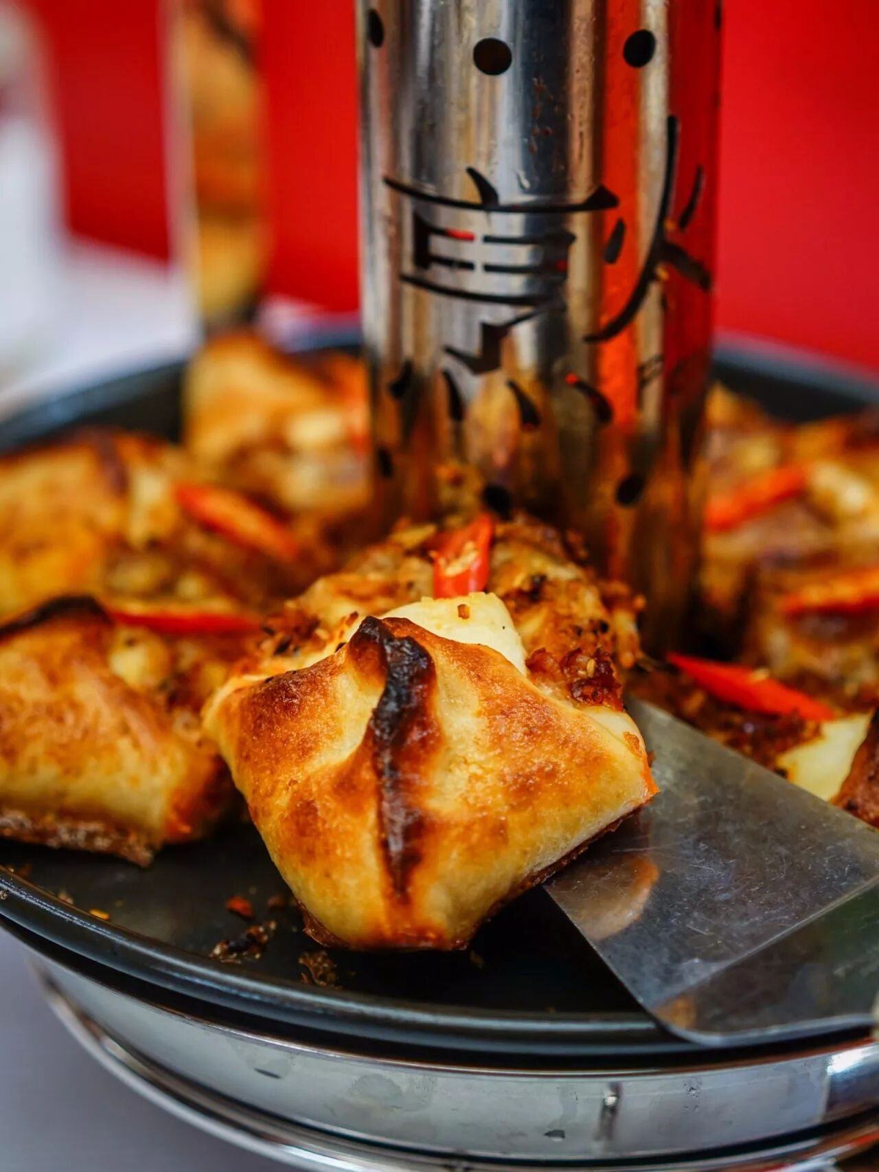 尤其推荐他家的这款独家麻辣披萨,做成三角形的模样本身就很讨喜了,除开有浓浓芝士外还有金黄的炸蒜,哎呀那搭配,想想都香的很呀~