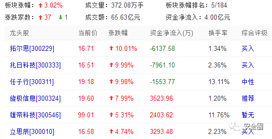 板块内个股全线飘红,拓尔思、兆日科技、任子行三股张停,美亚柏科、北信源涨逾5%,立思辰涨逾4%。