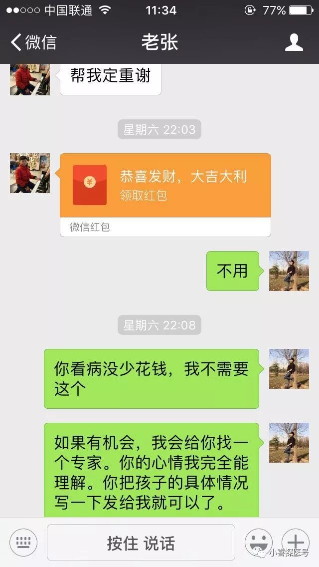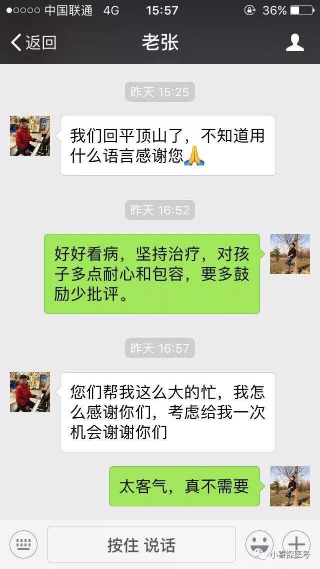 当天晚上,老张带孩子到家后发来信息说:以后要尽量克制自己的情绪,坚持给孩子治疗直到治愈。