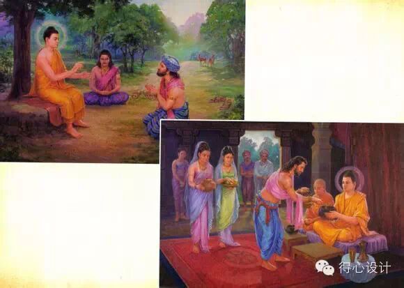 两位商人供养米糕(EON注:他们是此世间最早的归依者,当时世尊手里还没有容器受食,而历代诸佛都不以手直接接东西吃,所以图里有点不收的意思,随后四大天王各带了一个钵献给世尊,相传世尊将4钵化合为一然后受食)