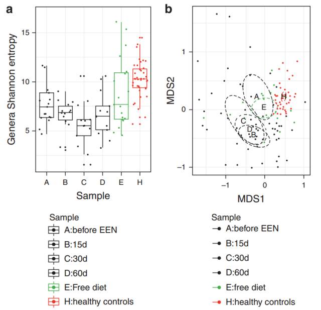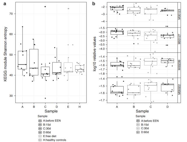 (四)接下来是,饮食疗法中的早期肠内营养(EEN)对小儿克罗恩氏病(一种自身疾病,主要在小肠)治疗过程的肠道微生态变化的研究。实验设计:选择23名小儿克罗恩氏病患者和21名健康儿童作为研究对象。分别在EEN治疗前、治疗中以及治疗后儿童恢复常规饮食时收集共117个粪便样品,进行16S rDNA测序。然后从中选择69个样品(CD患者56名,健康儿童13名)进行宏基因组测序。研究结果:研究表明小儿克罗恩氏病患者和健康儿童肠道菌群结构存在差异,且患者肠道菌群结构随着EEN治疗时间的不同而不同。。其中,毛螺菌科的一些属和梭菌目的2个属在健康儿童中富集,而消化链球菌属等则在患者肠道中富集。研究还对粪便钙卫蛋白(肠道疾病标记物)含量与克罗恩氏病患者相关性进行了检测,发现患者肠道菌群中有26个属与钙卫蛋白显著相关。通过宏基因组测序对EEN治疗前后健康儿童与患病儿童肠道菌群的基因功能进行预测,发现在EEN治疗前,CD患者肠道中多数基因参与参与泛醌、脂多糖生物合成、双精氨酸转运途径,而健康儿童中多数基因则参与脂肪酸生物合成、硫还原过程。参考文献:Quince C, Ijaz U Z, Loman N, et al. Extensive Modulation of the Fecal Metagenome in Children With Crohn’s Disease During Exclusive Enteral Nutrition[J]. The American journal of gastroenterology, 2015, 110(12): 1718-1729.