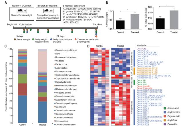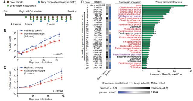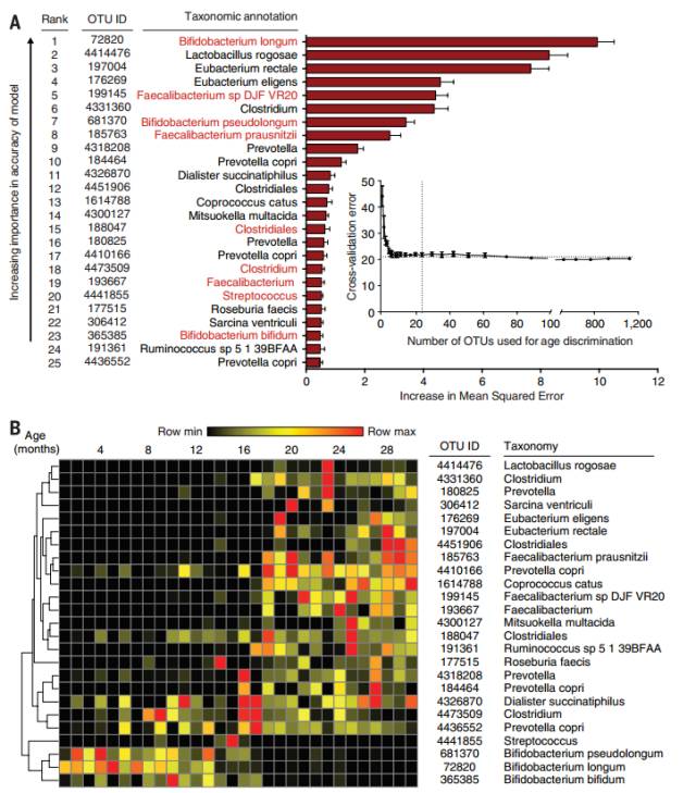 (五)儿童营养不良是一种极其严重的全球健康问题,后期极易造成发育障碍、神经系统发育异常、免疫系统紊乱等问题,且通过治疗干预无法有效缓解疾病。下面这篇研究通过16S测序揭示儿童营养不良与肠道菌群紊乱的因果关系,发表在《Science》上,厉害!实验设计:①从马拉维南部地区的5个农村地区收集317对双胞胎和3对三胞胎(年龄在0-36个月)的粪便样品,选择其中27对双胞胎和2对三胞胎的220个粪便样品进行16S测序。②收集19个婴儿(其中9个婴儿6个月大,另外10个婴儿18个月大)的粪便,利用粪菌移植技术,将其分别移植到5周大雄性无菌小鼠体内,每个粪便移植给5个小鼠。移植前3天,所有的小鼠统一饲喂无菌饮食。移植成功后,连续观察4-5,收集小鼠粪便,进行16S测序。③为了探究这些生长速度随年龄变化而变化的菌群能否治疗婴儿的生长畸形,将接受健康儿童肠道菌群移植和营养不良儿童肠道菌群移植的小鼠放在一起饲养,统一饲喂食物,连续观察3个周,每周称2次体重,收集一次粪便进行16S测序。④将带有营养不良儿童肠道菌群的小鼠单独饲养,并向肠道中添加包括长双歧杆菌在内的5种微生物,连续观察21天,并定期检测粪便菌群组成。研究结果:利用0-28个月大的健康双胞胎的粪便样品,构建肠道菌群的RF模型,发现肠道菌群成熟度与婴儿年龄呈正相关。对接受粪菌移植后的小鼠粪便进行16S测序,结果显示接受健康儿童粪菌移植的小鼠明显比接受营养不良儿童粪菌移植的小鼠要胖,然而所有小鼠在食物吸收方面却没有显著性差异。接受6个月大婴儿粪菌移植的小鼠的生长率要比接受18个月大儿童粪菌移植的小鼠快,无论是健康状态还是营养不良状态下的粪菌。粪菌移植实验揭示肠道菌群成熟度与年龄之间的因果关系能够改善带有营养不良儿童肠道菌群小鼠生长状况的OTUs类群结论:本研究不仅证明人体肠道菌群的成熟度与机体营养状态有关,而且证明二者之间存在因果关系,即由于饮食不当等原因,机体肠道菌群逐渐紊乱,而后导致营养不良。参考文献:Blanton L V, Charbonneau M R, Salih T, et al. Gut bacteria that prevent growth impairments transmitted by microbiota from malnourished children[J]. Science, 2016, 351(6275): aad3311.以上是锐翌小编汇总的这两年的关于婴幼儿肠道菌群相关研究的一些高分文章,宝宝肠道菌群健康,更利于成长哇。菌群发生改变的时候,是孩子成长的关键时间点,我们以前很难定量确定孩子的健康和营养状态,而现在,随着宏基因组学技术的发展,可以通过测便便来掌握宝宝肠道菌群的变化,量化孩子到底发育得怎样,营养到底够不够、均不均衡,科技发展的力量真是强大!生了二胎,以后孩子的各类健康问题,可有得操心喔。看来各位宝爸宝妈们也要时刻关注着我们生物科技行业的发展啊~