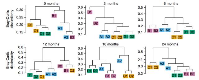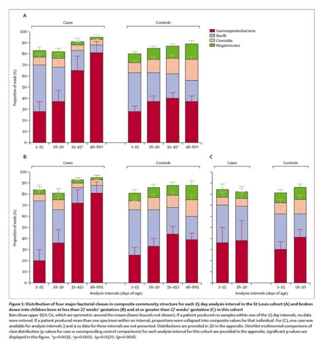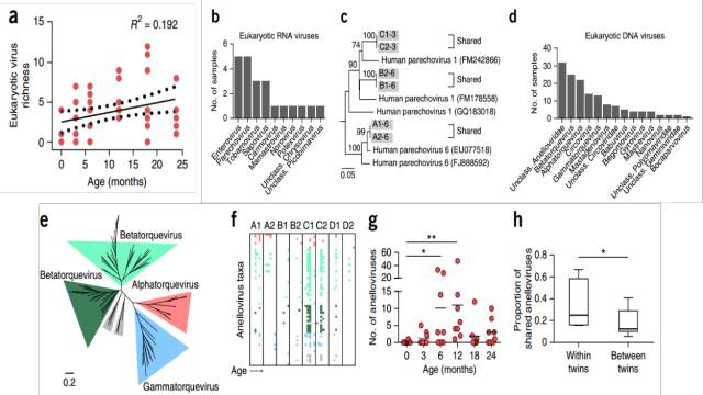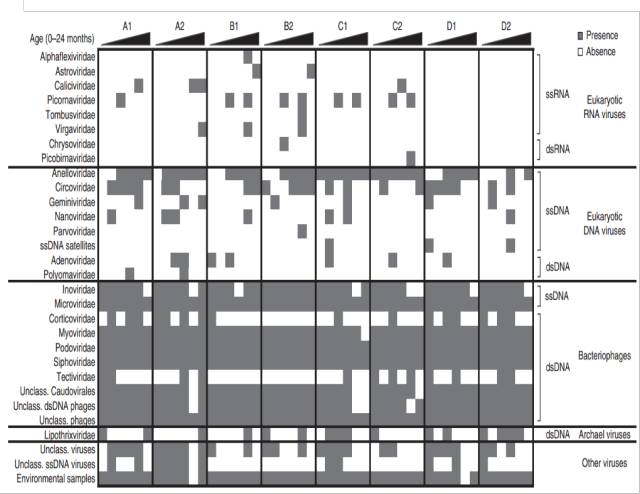 (二)极早产儿婴儿,一般体重小于1.5kg,其肠道菌群易失衡,容易患坏死性小肠结肠炎,英国著名医学杂志《柳叶刀》近期发表了重要研究成果。实验设计:研究分两组共166个早产婴儿,46个病例患坏死性小肠结肠炎(NEC),120个对照健康婴儿,根据成长阶段共取3586 个粪便样品,进行16SrDNA测序。 研究结果:患坏死性小肠结肠炎婴儿的肠道菌群与对照组有明显不同,特别是在出生后一个月。患儿的γ-变形菌纲细菌增加,而严格厌氧的细菌如Negativicutes减少。该项研究为未来通过干预菌群治疗坏死性小肠结肠炎打下坚实基础。γ-变形菌、杆菌、梭菌、厌氧菌Negativicutes在不同阶段患儿组和健康组中的比较参考文献:Warner B B, Deych E, Zhou Y, et al. Gut bacteria dysbiosis and necrotising enterocolitis in very low birthweight infants: a prospective case-control study[J]. The Lancet, 2016.(三)双胞胎婴儿肠道菌群的动态变化研究,又会有什么新的发现哪?实验设计:选择4对健康的双胞胎婴儿,分别在出生后0、3、6、12、18、24个月时收集粪便样品。富集粪便中的微生物,并提取DNA,然后进行16S和宏基因组测序。研究结果:研究发现,婴儿出生后不久,肠道中已能检测出多种DNA病毒、RNA病毒、噬菌体以及古病毒。随着年龄增加,婴儿肠道中细菌丰度和多样性不断提高,尤其是梭状芽胞杆菌。层次聚类分析结果表明随着生长发育时间推移,双胞胎婴儿的肠道微生物组成要比不相关的婴儿更相似。病毒种类的丰度随着年龄增长而增加,表明婴儿肠道中的病毒是通过与环境接触而建立的。肠病毒、小RNA病毒、札幌病毒等是检测到的最常见的病毒种类。同一对双胞胎之间几乎拥有相同的小RNA病毒,而不同双胞胎之间则不同。双胞胎婴儿之间共有的病毒以及RNA和DNA病毒随年龄增长的变化 参考文献:Lim E S, Zhou Y, Zhao G, et al. Early life dynamics of the human gut virome and bacterial microbiome in infants[J]. Nature medicine, 2015, 21(10): 1228-1234.