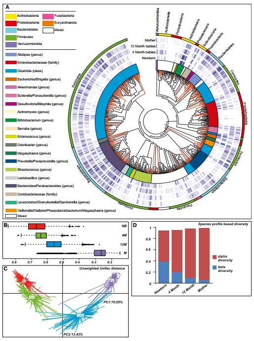 (一)顺产和剖腹产,母乳喂养和奶粉喂养对婴儿肠道菌群的影响有何不同?看这篇研究怎么讲!实验设计:取98位母亲生产当天,98个婴儿出生1天,4个月,12个月的粪便样品(其中15位母亲为剖腹产,83位母亲顺产)。用Illumina Hiseq2000,PE100bp测序平台进行宏基因组测序,平均每个样品得到3.99Gb数据量。研究结果:婴儿不同阶段肠道微生物组成和功能在显著差异,顺产婴儿比剖腹产婴儿肠道微生物更像其母亲肠道菌群。与婴儿氨基酸代谢相关微生物随着成长发生变化,与重要氨基酸转运相关微生物在婴儿4个月之前一直是增加的。母乳喂养12个月后,宝宝的肠道菌群组成变得与妈妈非常相似,停止母乳喂养可驱动婴儿肠道菌群趋于成人肠道菌群。母亲及三个阶段婴儿肠道微生物比较(A.系统发育树; B肠道微生物差异的箱形图; C.PCoA分析; D多样性分析)参考文献:Bäckhed F, Roswall J, Peng Y, et al. Dynamics and stabilization of the human gut microbiome during the first year of life[J]. Cell host & microbe, 2015, 17(5): 690-703.