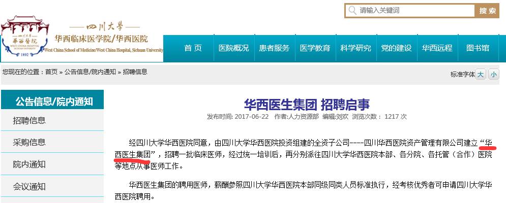 近日,业内传来一重磅消息!四川大学华西医院发布官方消息:建立“华西医生集团”,面向社会公开招聘,下图为官方网站发布的招聘启事截图。