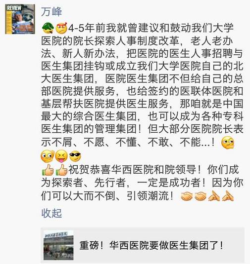 1998年就“下海”、试水医生集团至今的万峰,赞华西是“探索者、先行者,一定是成功者”。他表示:“四五年前,自己就曾建议和鼓动大学医院的院长,探索人事制度改革,老人老办法、新人新办法,把医院的医生人事招聘与医生集团挂钩,或成立北大医生集团。医院医生集团不但给总部医院提供服务,也给签约的医联体医院和基层帮扶医院提供医生服务,那咱就是中国最大的综合医生集团,也可以成为各种专科医生集团的管理集团!”