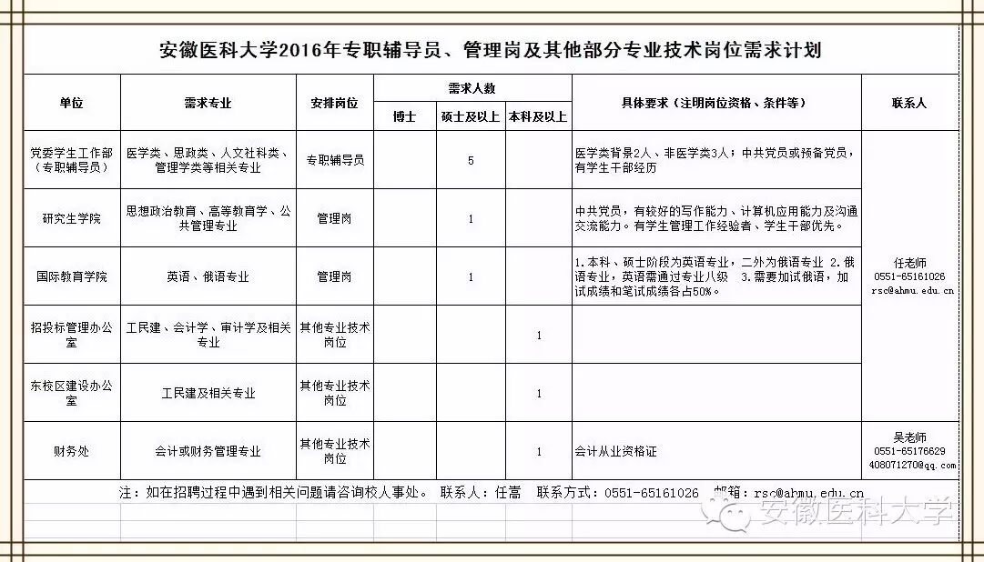 详见《安徽医科大学2016年专职辅导员、管理岗及部分专业技术岗位需求计划》(附件1)。