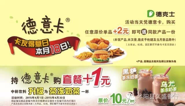 +2元买一送一:又一个德克士卡友日就要来了,对!没错!一个月也就18号卡友日当天持卡购买任意原价单品+2元送同款产品一份了(米饭产品、米汉堡、手枪腿及当月新品除外)。仅此一天,不容错过哦!