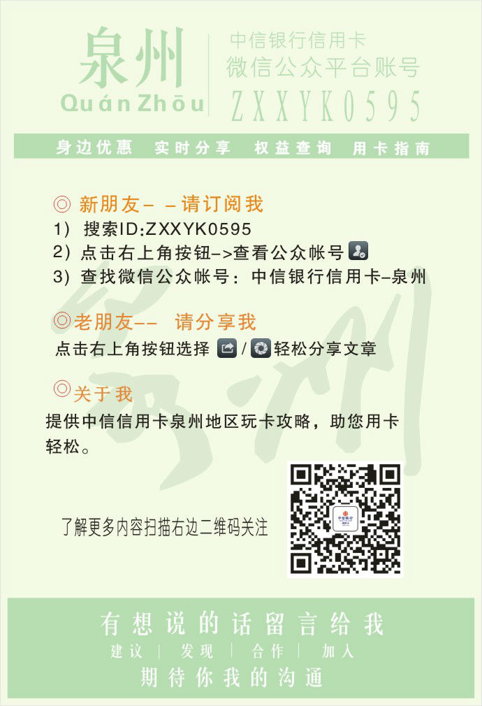 活动期间,持中信银行信用卡至泉州浦西万达广场以下商户即可参与满额直减、5折、买一送一,所有商户每人每月累计限享2次(不与店内其他优惠同享),数量有限,先到先得。