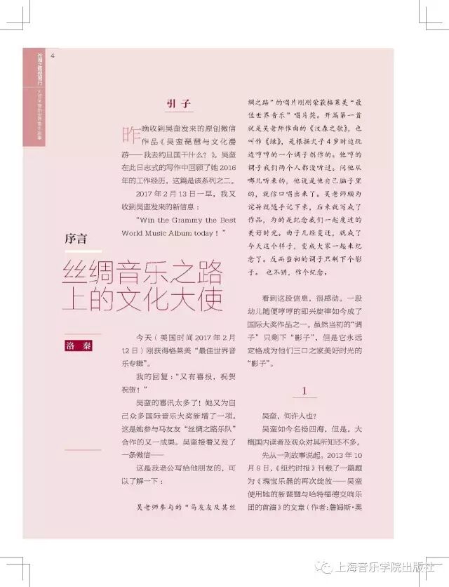 正因为有出版社的鼓励和积极推动,各位中外前辈老师朋友的支持,今天读者们才能拿到这本温暖的书。我非常感谢上海音乐学院出版社,及对书中各位作者真诚的敬意!