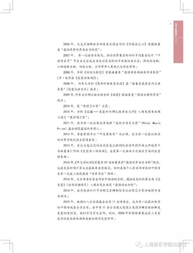 2017年获美国格莱美最佳唱片奖及7次提名最佳演奏和最佳专辑奖。委约及首演了百余首琵琶新作品,赋予琵琶在传统和现代音乐中的新角色,开创了新领域。2013年,荣获《美国音乐》“全美年度演奏家”奖,这是有史以来该奖项首次颁给一位非西方器乐演奏家。