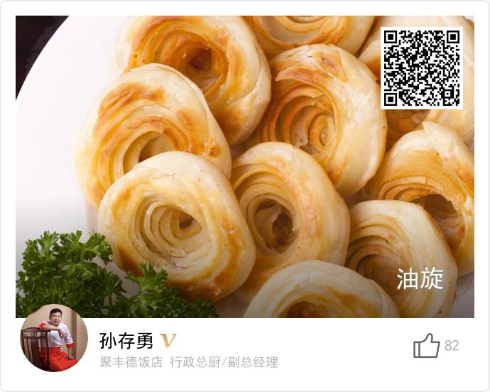聚丰德油饼,外皮酥脆,内瓤柔嫩,葱香透鼻。早年间的制作方法一直沿用至今,制作时用葱花拌入猪油,加盐,抹匀面饼。卷起来,形成旋涡状的油饼。用铁板煎至两面定型入烤炉烤3-4分钟即可。