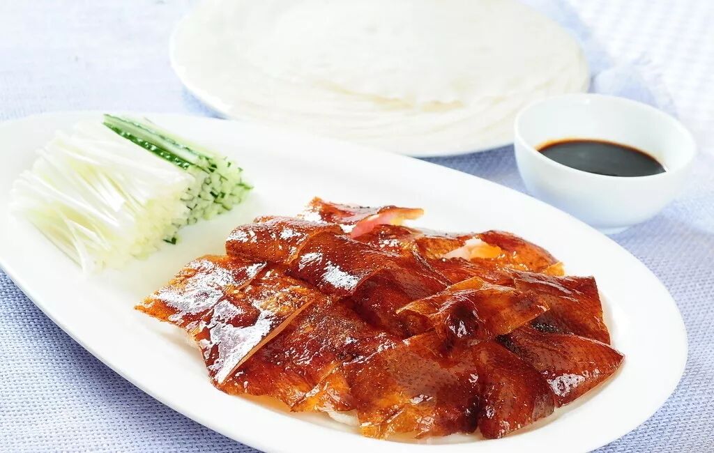 说到北京烤鸭,尤其全聚德烤鸭,那是离不开章丘大葱的。将葱白横切成一样长短的小段,竖切成粗细均匀的葱丝,蘸上甜面酱,伴着烤鸭来吃。葱味不辣,香且甜,汁水足,但不象黄瓜条水分那么多,更能解腻讨喜。