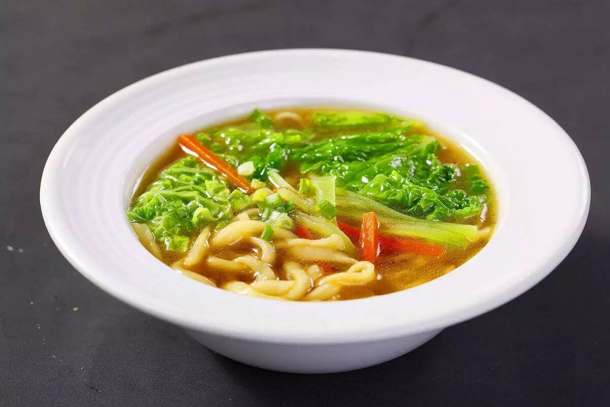 炝锅面,所用的是大梧桐葱的中段部分,即葱叶和葱白的中间那一截,既有一点儿葱叶的呛,又带一点儿葱白的甜。热锅烈火一,连汤带菜一,再下入面条一,起锅时给一小勺胡椒粉即可。