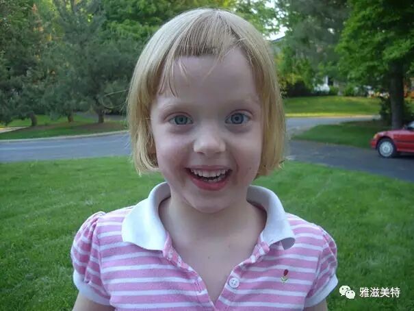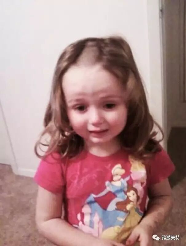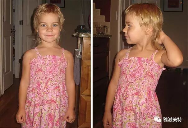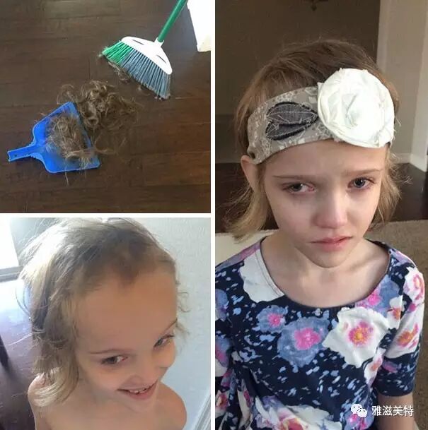 你看我女儿自己剪的头发,跟狗啃的一样,但她自己似乎一点不受影响。