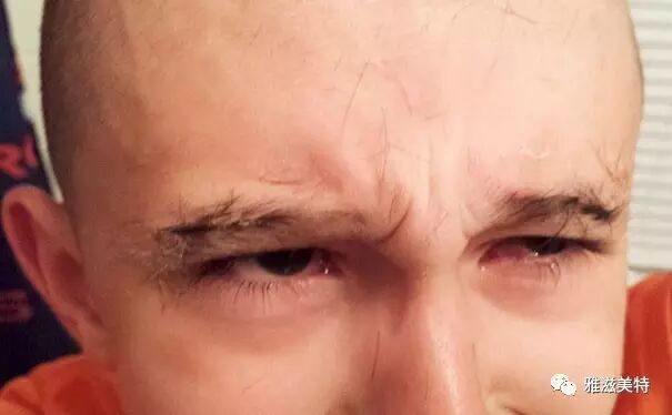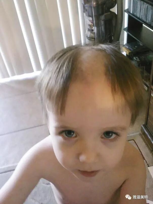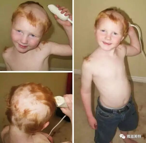 熊孩子本想修一下眉,没想到修秃了。他琢磨了一下,索性把想头发也剃了,想着粘在眉毛上可以补救。不幸的是,剃完后,他瞬间后悔了。