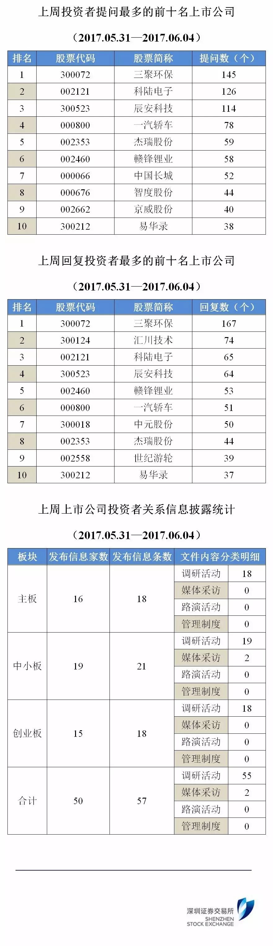 上周,我所互动易收到投资者日常问题共7435条,其中有效问题6190条,上市公司回复4916条(含本周对以往问题的回复);共有50家上市公司发布57条投资者关系活动记录文件。互动易APP目前已正式上线,进入以下网址可下载安装:苹果版http://t.cn/8sPr5SE,安卓版 http://t.cn/RaDGP20。