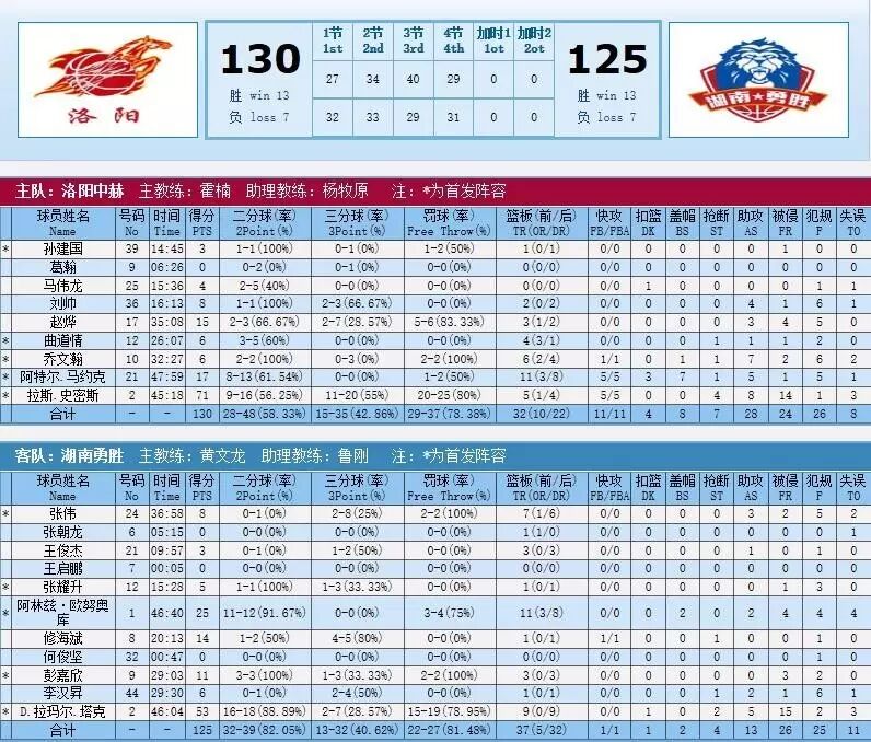 最后一节,奥努阿库吃技术犯规,犯规达三次。但洛阳场上三人五犯,刘帅六犯离场。比赛结束前三分钟,李汉升底线三分将分差缩小至3分,为勇胜带来一线生机。最后一分钟,塔克趁乱突破上篮打进,场上比分126-125,拉斯再次开炮,一记底线三分将分差扩大为三分。但塔克没有抓住最后的绝杀机会,最终湖南勇胜5分之差125:130遗憾败北。