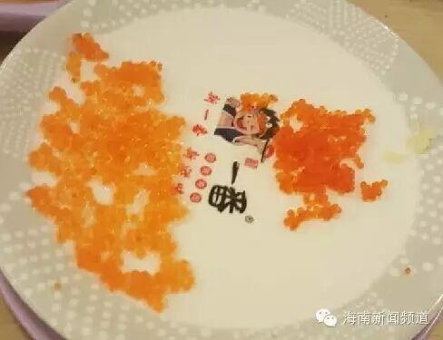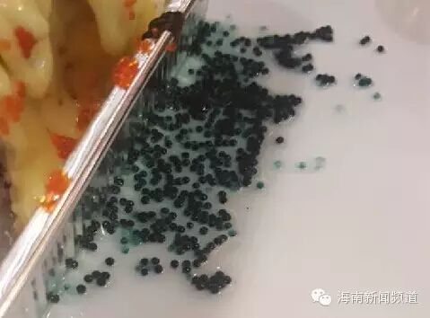 然后新闻君的记者小伙伴就走访了海口的几家寿司店,专门点有蟹籽的寿司,做起了实验,实验发现一些寿司上的蟹籽原来真的会掉色。开水浸泡后有些蟹籽甚至都接近透明▼