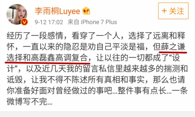 但李雨桐的微博说当时薛之谦是这么解释两人离婚时的状态的:高磊鑫说她流产了,薛就怀疑是被骗了,和她提出离婚。高便索要了1000万离婚费,否则就要爆料。