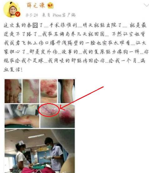 而激起了我八卦之心的,是李雨桐今天爆料中提到的,当年她和薛之谦去泰国拍淘宝店新品衣服时,薛之谦开车带着她飙车,结果出了车祸。爬起来后,薛之谦一边飙血一边给经纪人打电话,让团队赶快报道他在泰国出了车祸的消息。等到了医院,在包扎前的最后一刻,薛之谦依然坚持拍下李雨桐腿部受伤的特写,并警告李雨桐不要告诉别人、也不要暴露自己的伤——因为这个伤,被薛之谦“征用”了,后来出现在薛之谦的微博里,成了他的“伤”。