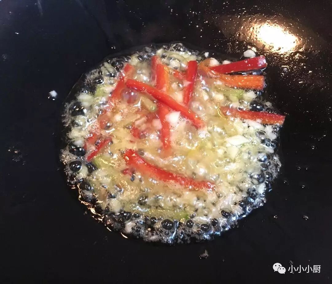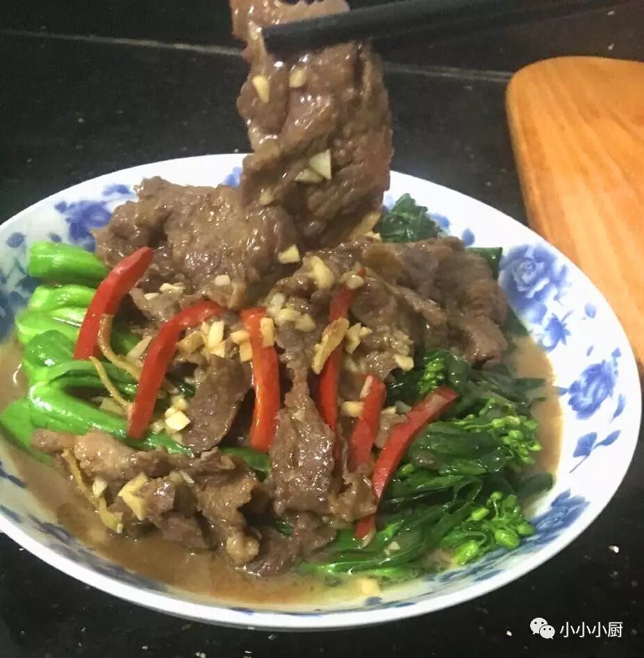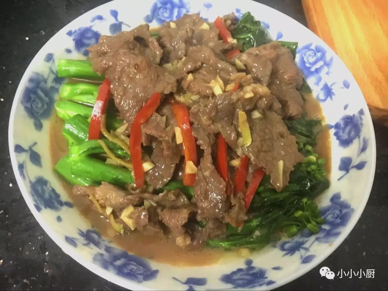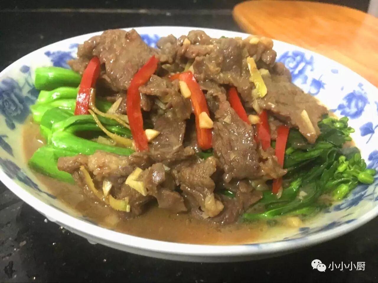 放入牛肉翻炒(喜欢沙茶酱的这个时候可以下一点一起煸炒),如果太干可以再加点淀粉水,加入红椒丝煸炒至变色,马上盛出连肉带汁淋在装好盘的芥蓝上。