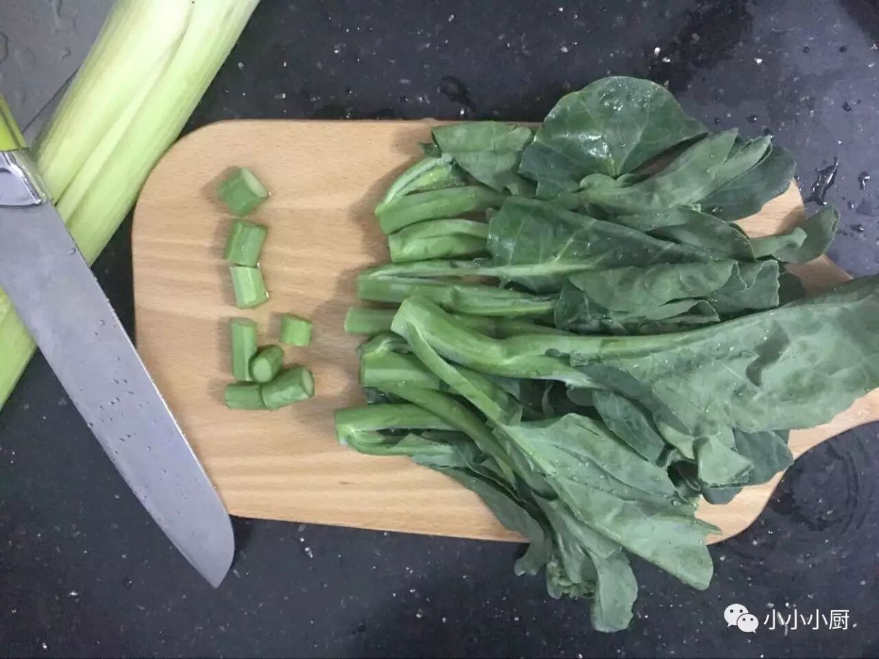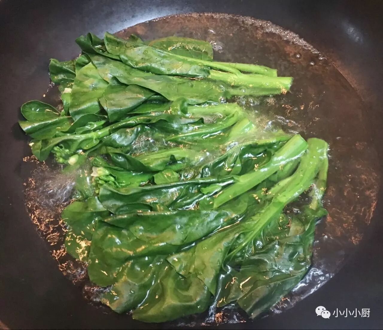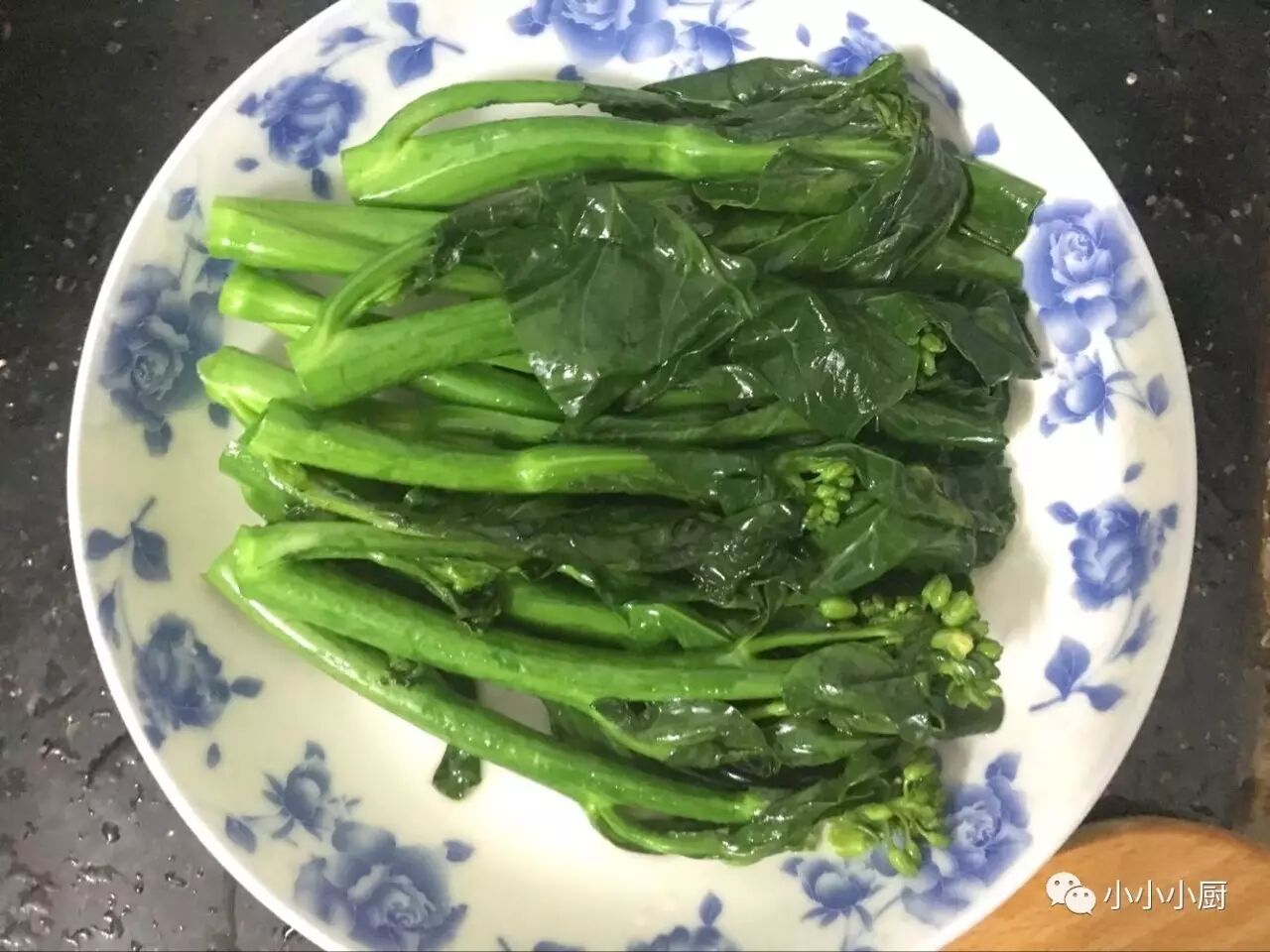 芥蓝放入开水中焯烫至断生,记得在水里加入适量的盐、糖、油、盐是为了让菜有底味,糖是为了把菜里的清甜味带出来,油是为了让菜更油亮翠绿。