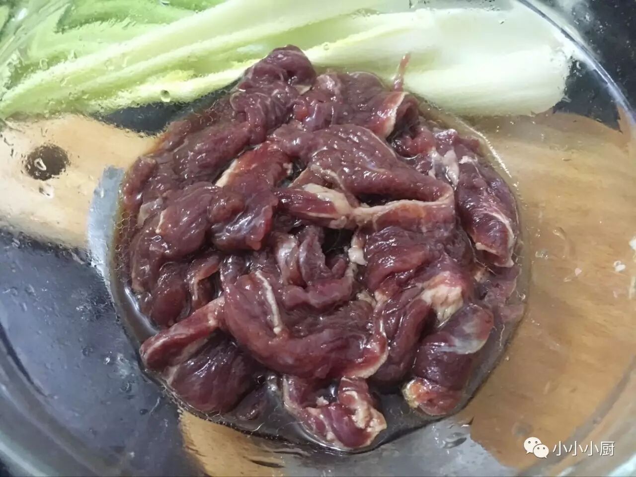 牛肉切片,加入适量的盐、糖、味极鲜酱油、料酒、食用油腌制半个小时,再放入生粉搅拌。