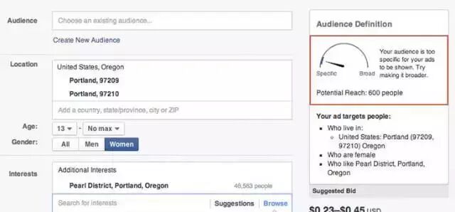 正因为Facebook的用户信息(包括兴趣、就业经历,年龄和婚恋状态)和地理坐标目标投放能力(可到邮政编码层级)这两大宝藏,Facebook允许中小企能极其精准的使用其预算,亦能极其精准的针对所希望触及的受众人群进行广告投放。