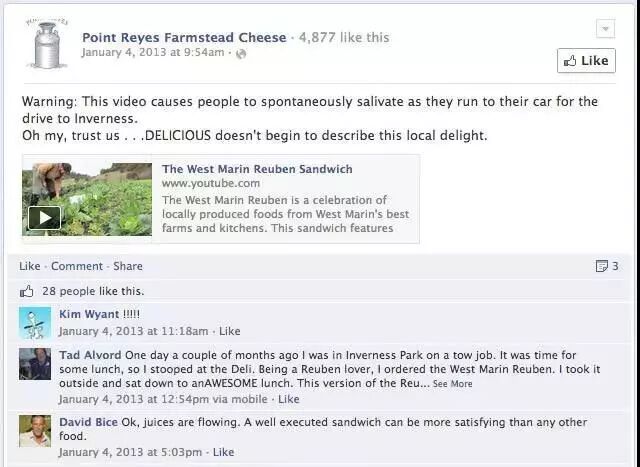 也别忘了在你的帖文里嵌入视频内容!以下就是来自Point Reyes Cheese的极佳示例,用视频的内容展示了含有其芝士产品的三文治的制作过程。这一些片段能极大的激起粉丝的好奇心并鼓励他们点击观看。