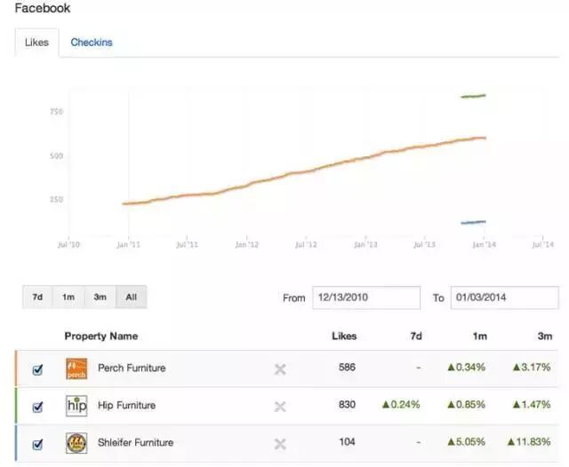 需要特别注意这些趋势曲线——如果你或你的竞争对手在某一个特定日子或前后几天急剧的增加了粉丝的数量,前往Facebook并查阅那个日子及附近时间的Facebook上的活动内容,来寻找是什么内容或活动如此成功。有样学样,也许能给你不同的启发。