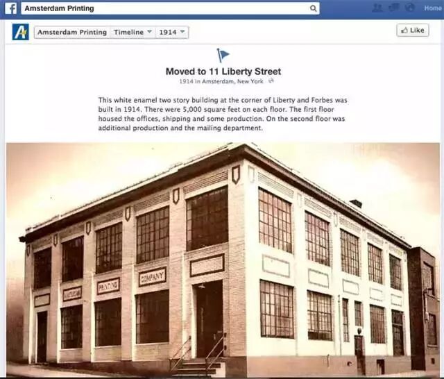 另一个创造性使用Facebook的图像的例子是Amsterdam Printing,它用Facebook时间表来展示它的公司发展历程,用图片和文字描述来展现其115年历史中的大事件。