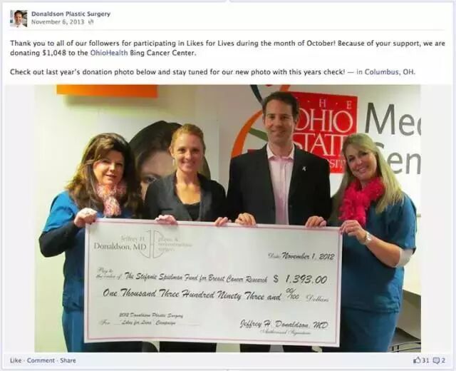 慈善机构或NGO合作会是一个既能推广公司又能同时建立关怀形象的好方法。Dr.Jeff Donaldson的“Likes for Lives”(为生命点赞)活动就是一个非常成功的运用这种合作方法的例子。在活动的一个月时间里,凡是他的Facebook专页获得一个点赞,他就为俄亥俄州Health Bing Cancer机构捐赠一美元。