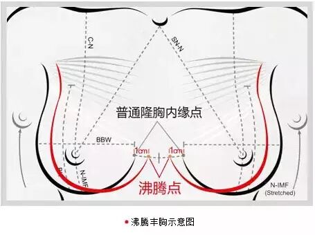 在植入的位置上,”沸腾沟“丰胸术使每一侧的内缘点能较普通隆胸技术更深入1cm,两侧合计至少靠近2cm的距离,这样塑造出的乳沟效果,更集中,更性感。”