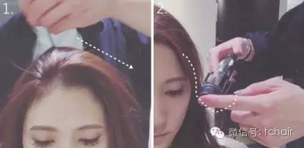 Step1 :这款是针对刚刚上边交过的自然弧度发型,用一个38mm卷发棒,取左右两边的头发,先将头发向外卷一个弧度