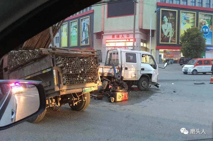 一早就有朋友遇上突发路况,发来几张图片。在磨头主街道福家超市前路口,一辆载满钢管的拖拉机与一辆小货车相撞,拖拉机头与车身分离,受损严重。事故责任自有交警来认定,幸运的是事发在早晨,路上车辆相对较少,滚落在地的钢管没有造成后续二次事故的发生。