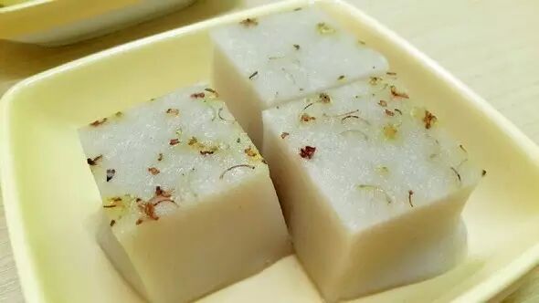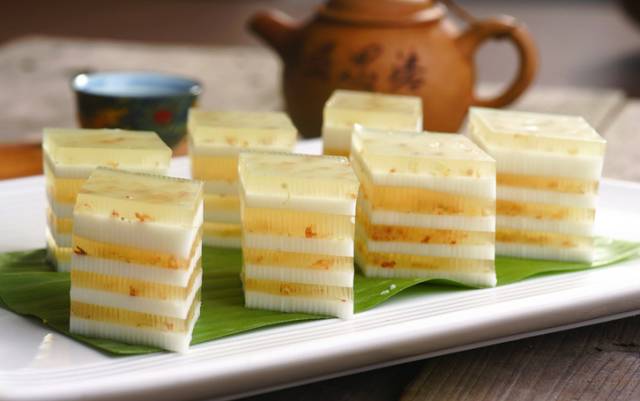 我们常吃的桂花糕呈方块状,面有一条条压制的格纹,是用糯米粉、糖和蜜桂花为原料制作而成的美味糕点。不仅洁白如玉、清甜爽口,做法简单,其种类的多样性,深受大家的喜欢,满足人们对于味道的各种需求。