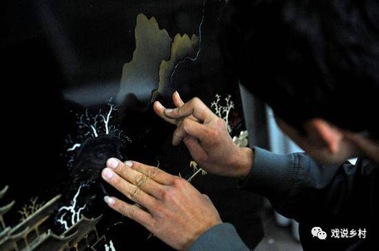 平遥漆艺传承人薛生金的弟子张勇兴用手抹匀漆画上的颜色