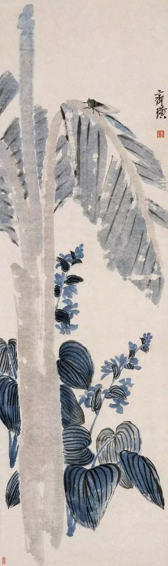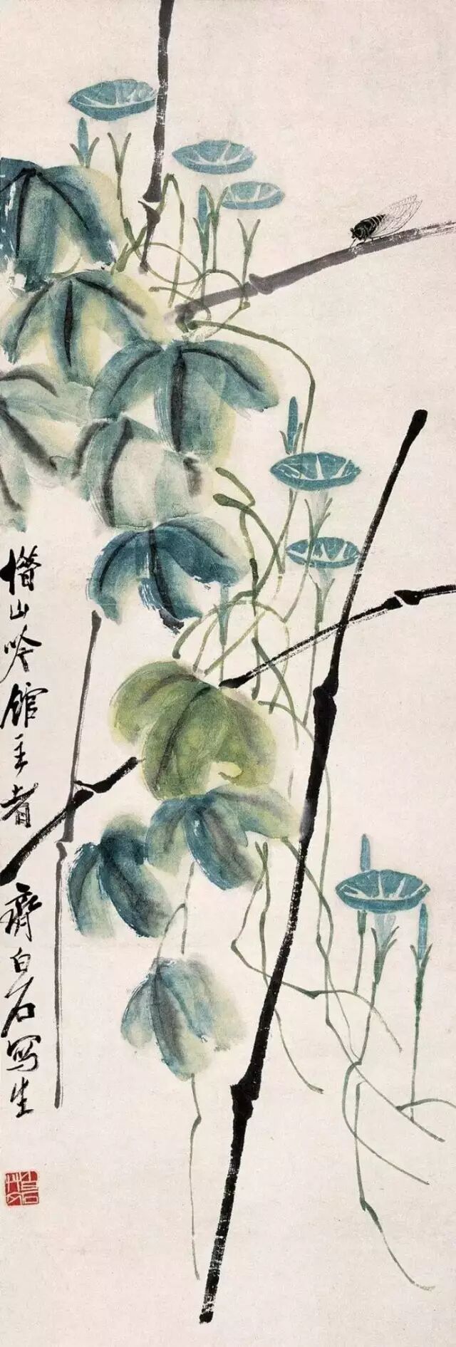 齐白石画蝉来源于他对生活的热爱,来源于他对生活细致入微的观察。他通过长期的深入观察,再加上自己反复琢磨融汇贯通,终于形成了自己的风格。齐白石蝉造型质朴简洁、色彩丝丝入扣,笔墨自然,亲切可感,画风生机勃勃,充满了浓郁的生活气息。
