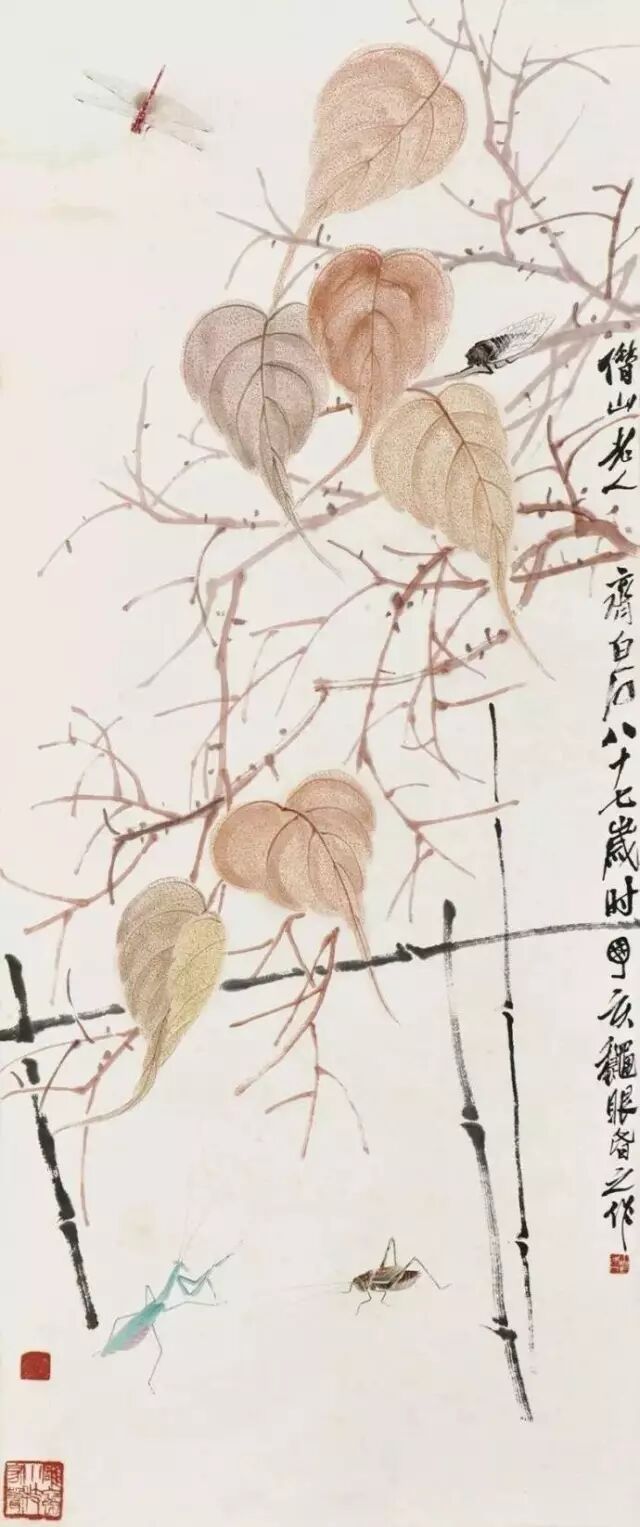 其蝉虽极工整,甚至极度逼真,但绝不是简单平庸地对自然景象的模拟再现,而是有选择地精思与提炼概括,即艺术化,从而达到了齐白石所言的:“不似则欺世盗名,太似则媚俗,吾画在似与不似之间”。